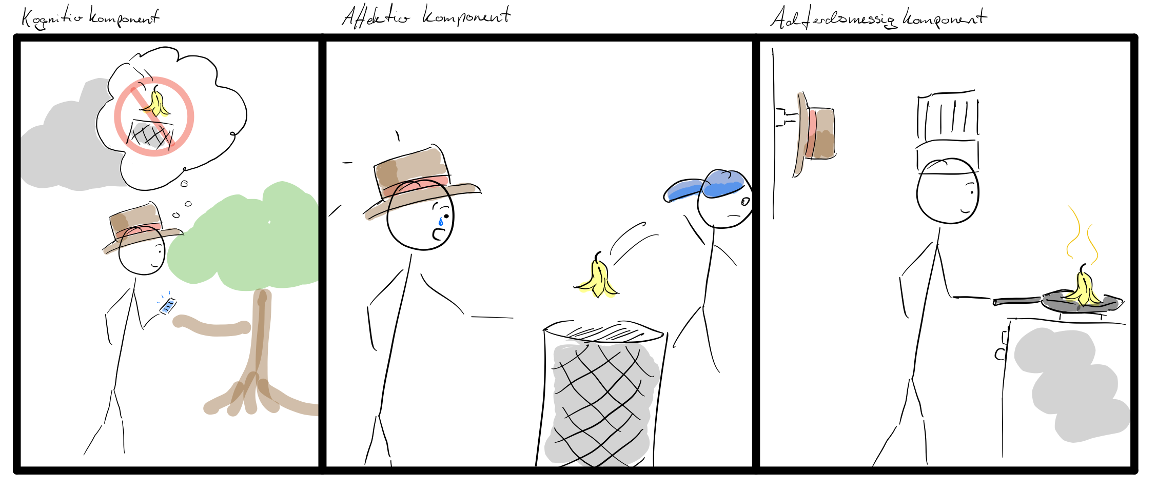 - Kognitiv komponent – Dette er dine bevisste eller ubevisste tanker som «Det er viktig å utnytte matvaren og kaste så lite som mulig» «Det er vanlig å skrelle gulrøtter før man spiser dem.» «Brokkoli-stilk og gulrotskall smaker sikkert ekkelt»